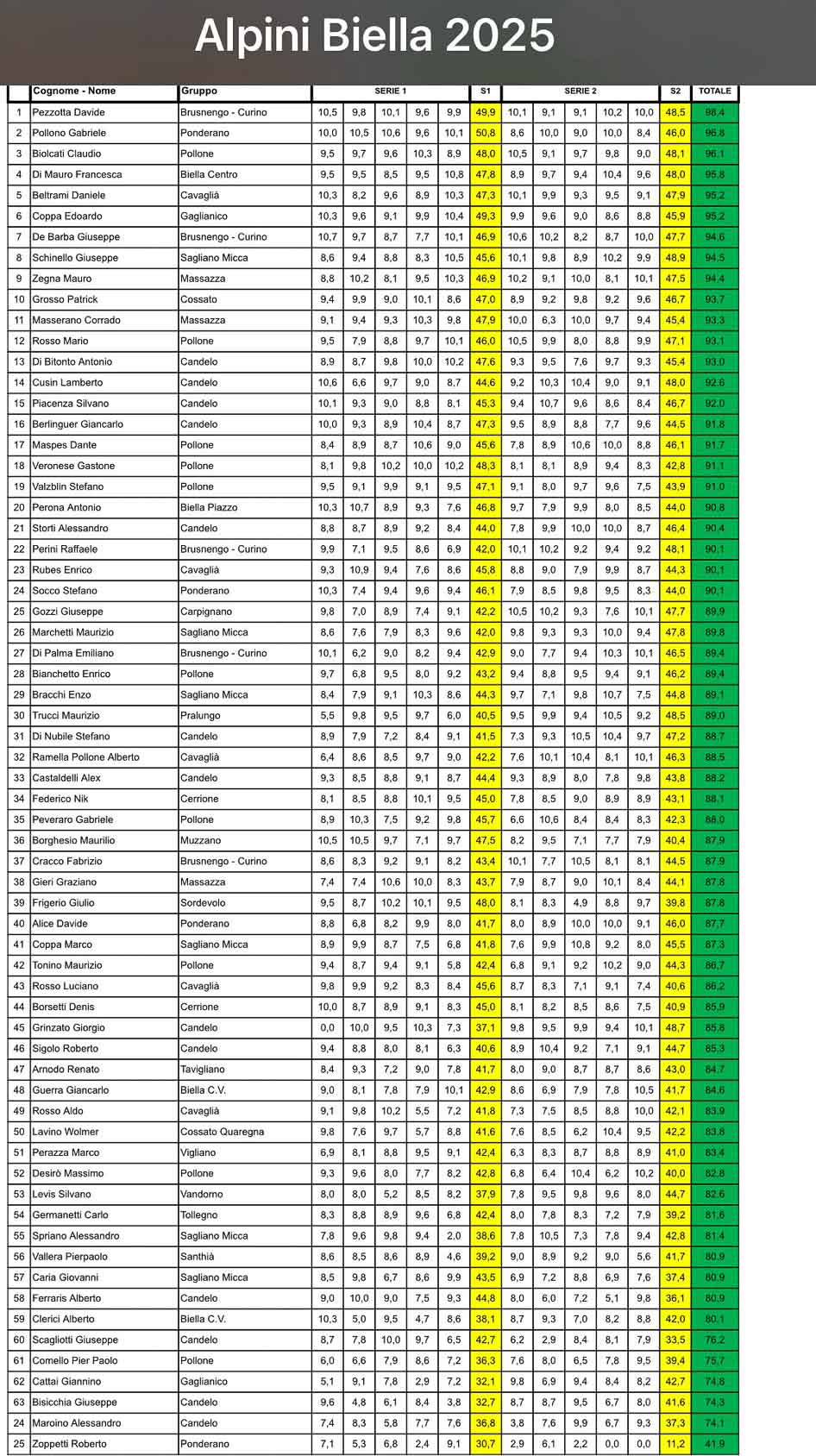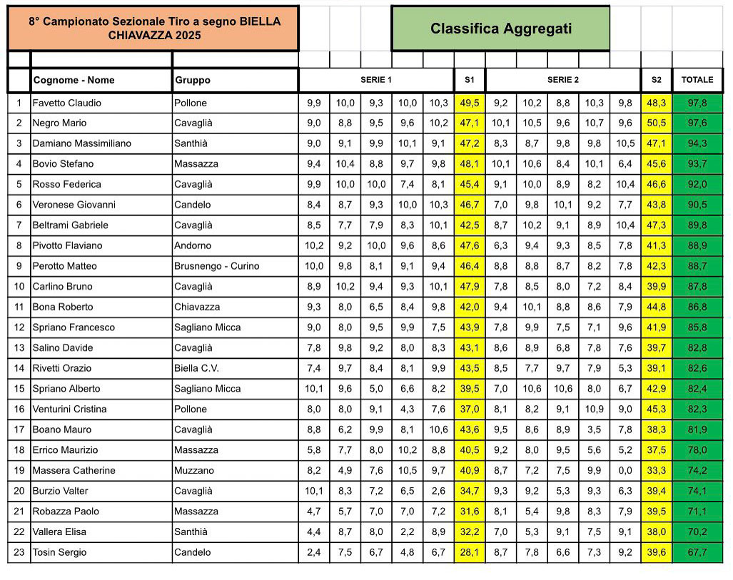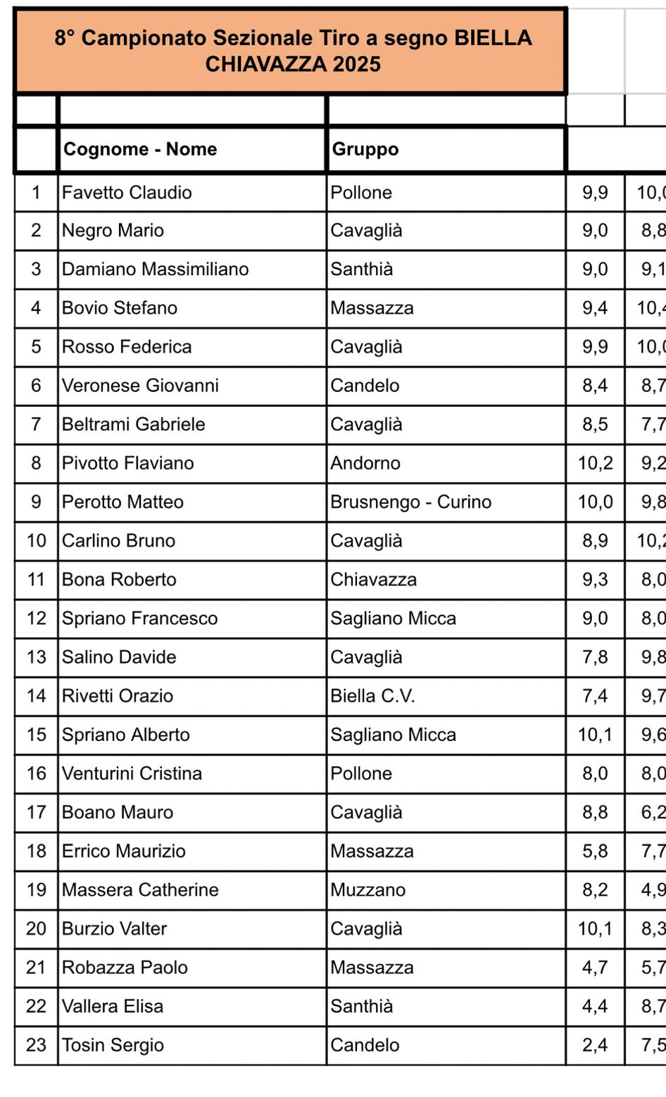 Sabato 14 novembre si è svolto il Campionato di Tiro con la Carabina ad aria compressa  della Sezione di Biella.  Sulle linee dei 10 metri del Tiro a Segno Nazionale di Biella, in via Collo Capra a Chiavazza, si sono alternati oltre ottanta tiratori, seguiti dagli istruttori del sodalizio.                                                                                                                        Nella categoria Alpini si è imposto Davide Pezzotta. Il tiratore del gruppo Brusnengo Curino ha preceduto Gabriele Pollono, Gr. Ponderano. Terza piazza per Claudio Biolcati Rinaldi Gr. Pollone, davanti a Francesca Di Mauro del Gr. Biella Centro Vernato e ad Daniele Beltrami di Cavaglià.Vittoria di Claudio Favetto fra gli Aggregati. Il portacolori del Gruppo di Pollone ha superato di pochissimo, Mario Negro Gr. Cavaglià. Terzo posto per Massimiliano Damiano Gr. Santhià, quarto posto Stefano Bovio Gr, Massazza e quinto posto posto per Federica Rosso Gr. di Cavaglià.    Il Gruppo con più atleti tiratori Candelo.   Alla ricca premiazione era presente per la Sezione il Vice Presidente Vicario, Alberto Ferraris ed il Consigliere Stefano Socco.                                                                                                                          G.G:                              foto: Stefano Socco