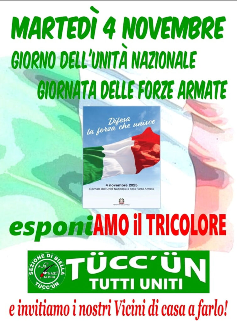 Alpini, Amici degli Alpini e Aggregati della Sezione di Biella sono orgogliosi di fare la loro parte, ieri come oggi, con cuore, impegno e amore per l’Italia e invitano tutti a unirsi a loro in questa giornata, per ricordare insieme, TÜCC’ÜN, il valore della nostra storia e il senso profondo della nostra identità.