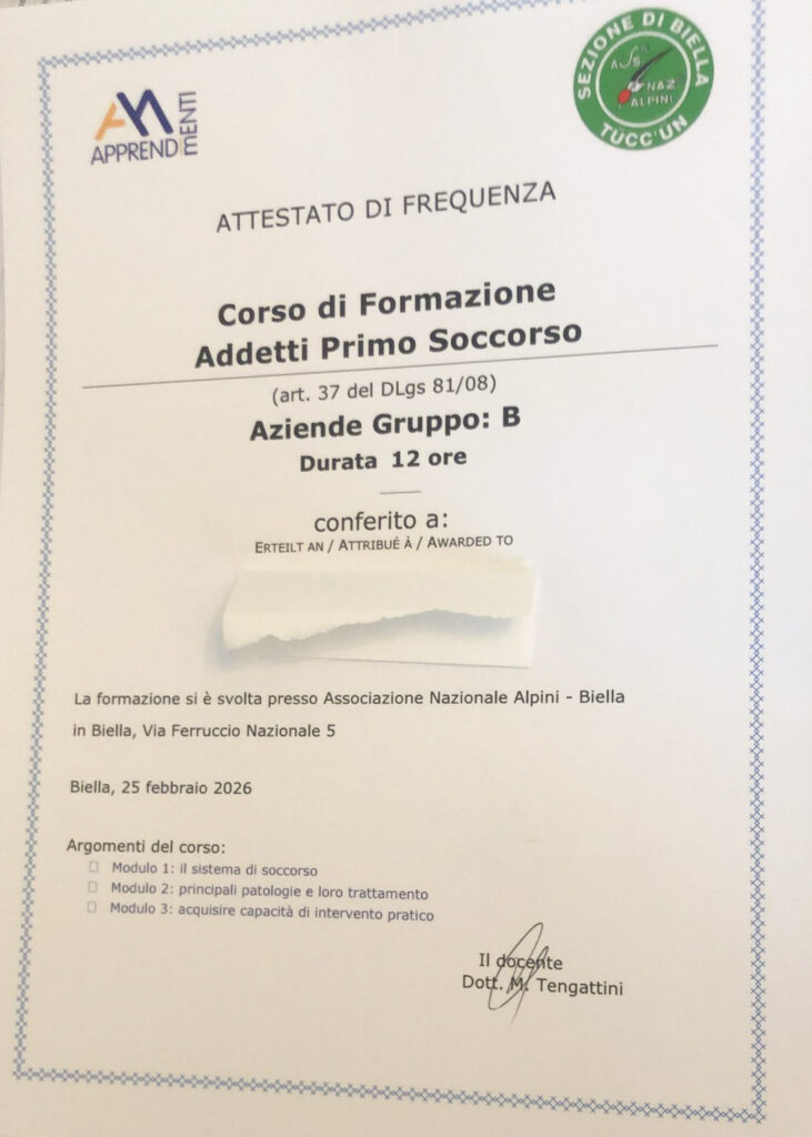 E’ terminato il corso organizzato presso la sezione di Biella di Primo soccorso cat. B della durata di 12 ore diviso in tre giorni. Argomenti del corso: –