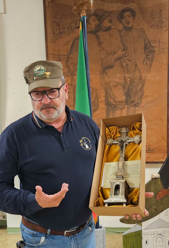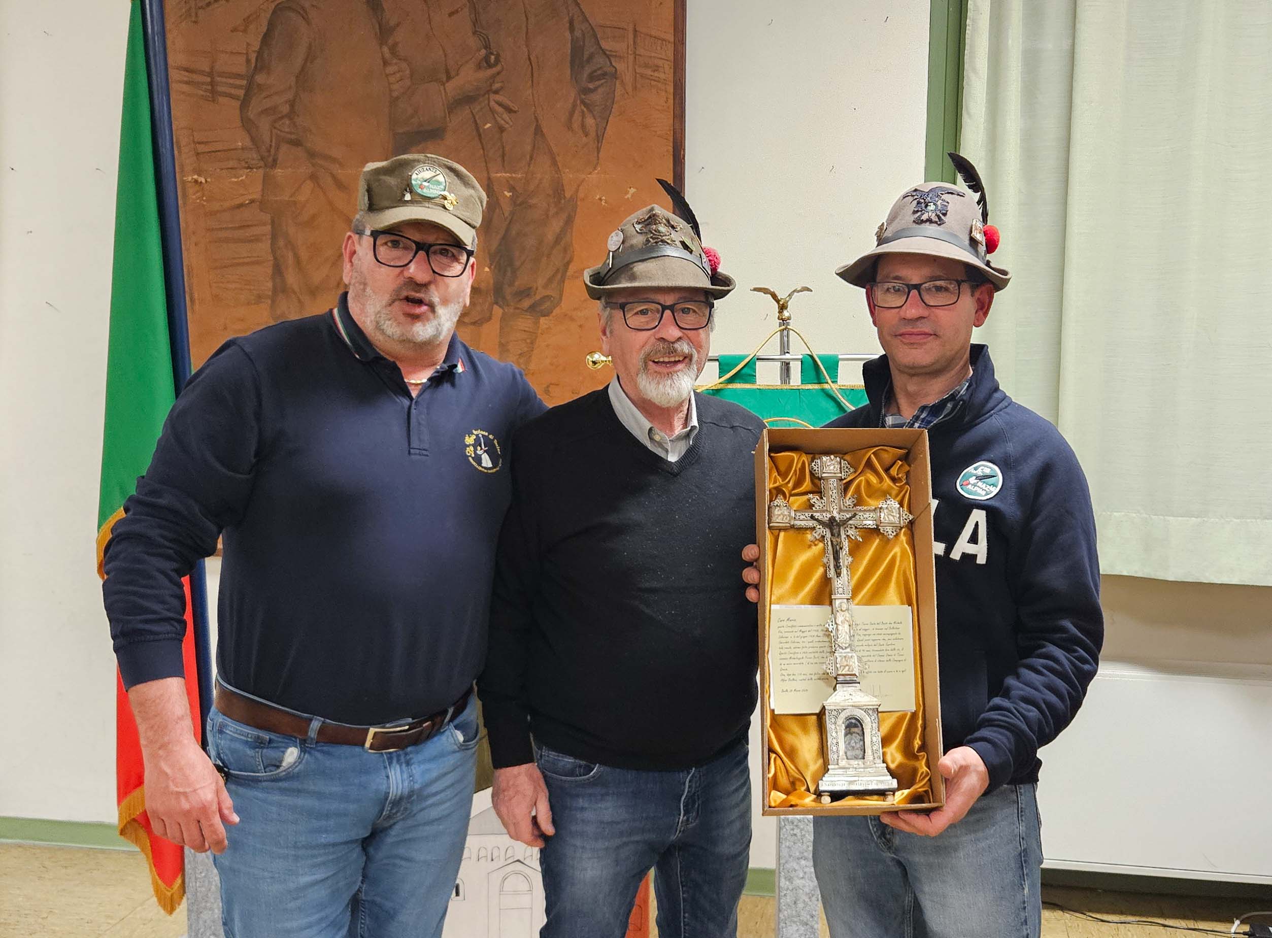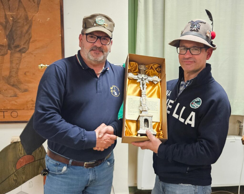 Sempre durante la cena, il direttore del giornale della sezione di Torino, il Ciao Pais, Luca Marchiori, ha donato agli alpini biellesi un Crocifisso storico del 1908 contenente una reliquia del Sacro Sepolcro e con su scritto “I SACERDOTI BIELLESI IN PALESTINA Maggio 1908”, da più di 90 anni custodito dalla sua famiglia.