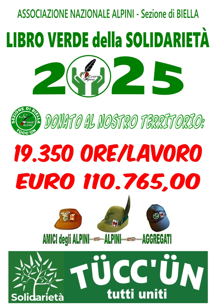 Come sempre, leggendo i dati per il Libro verde della solidarietà comunicati dai Gruppi, il primo sentimento è l’ammirazione per l’impegno che Alpini, Amici degli Alpini e Aggregati della Sezione di Biella mettono in campo a favore delle loro comunità! Impegno profuso anche nel 2025 pur con tutti stra-impegnati per la nostra Adunata; la nostra solidarietà è sotto gli occhi di tutti, ma molte volte è svolta in modo silenzioso e non appariscente, perché questi dati sono di certo in difetto, considerato che molte iniziative sono fatte senza esser segnalate, nello spirito alpino del fare in silenzio e non del fare per finire in fotografia o sui giornali!