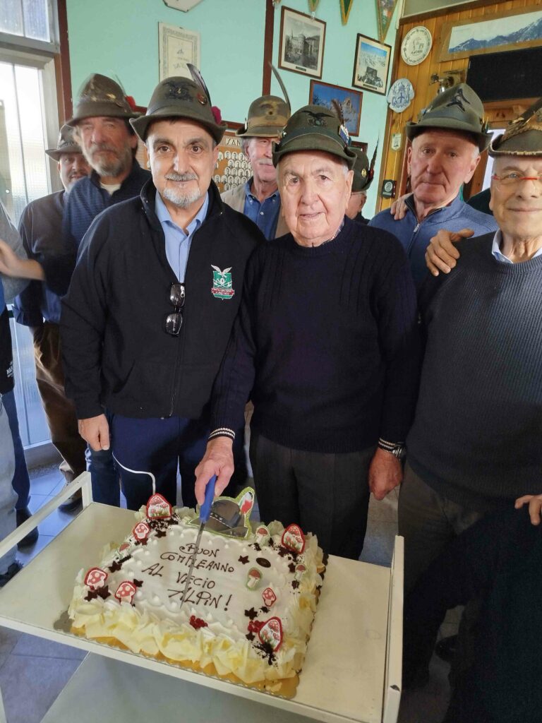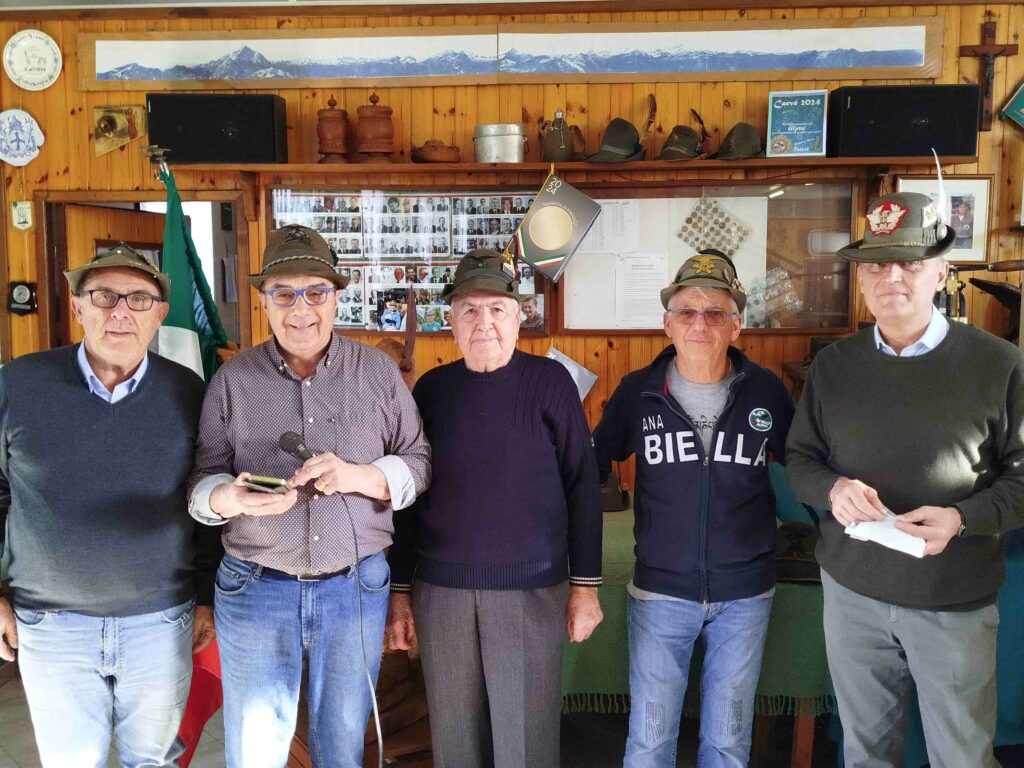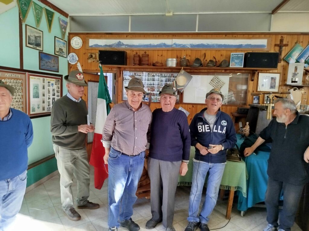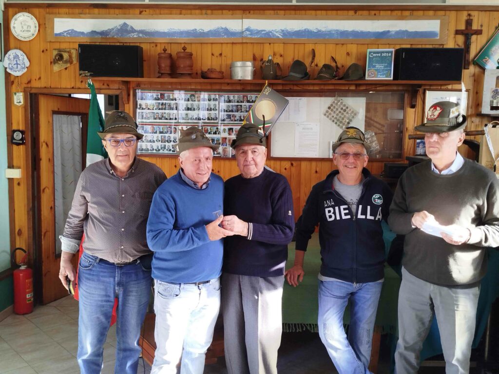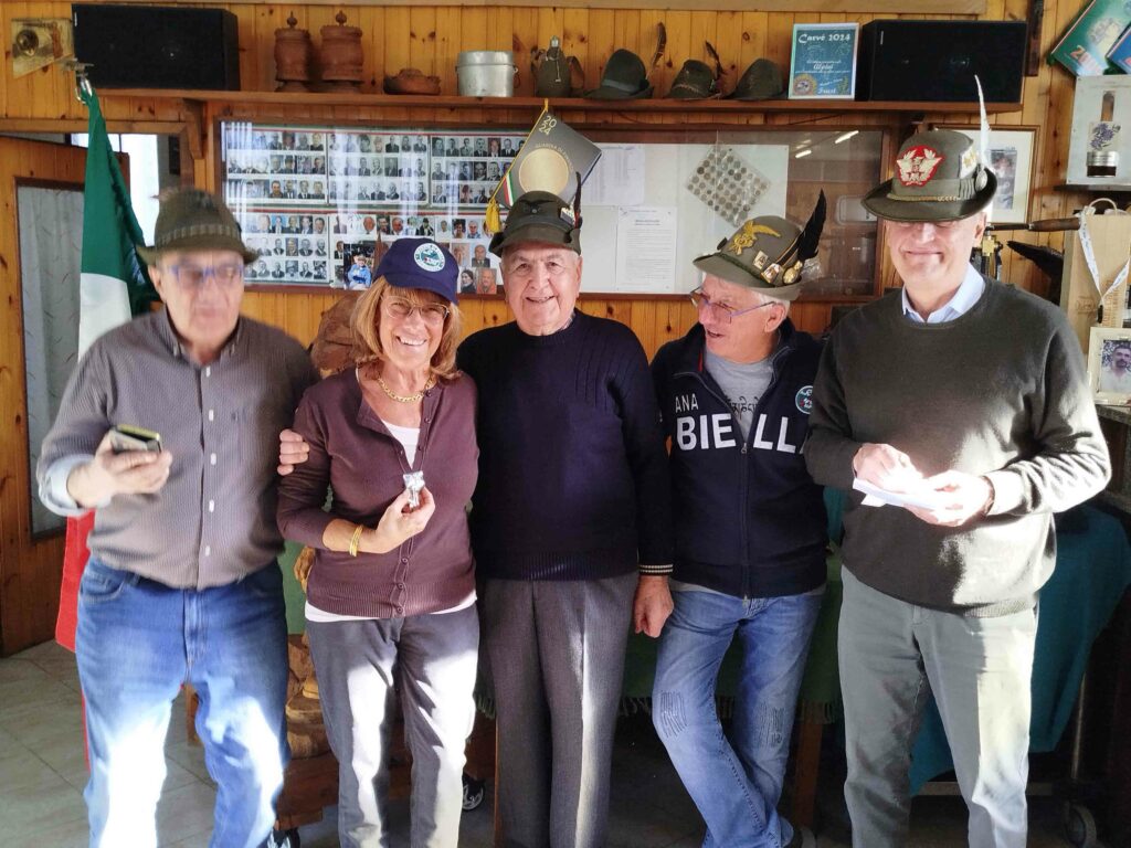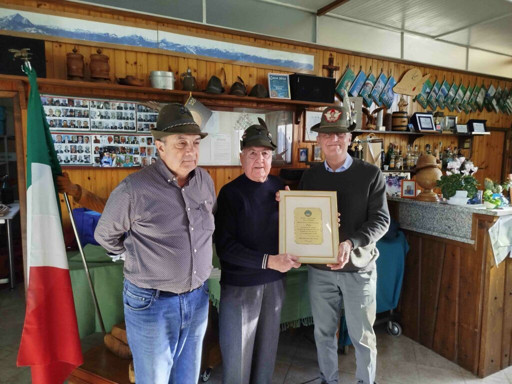 Domenica 23 Novembre, durante i festeggiamenti per i  90 anni del decano del gruppo di Santhià Primo Ruffilli, il capogruppo Beniamino Averono con i consiglieri sezionali Maurizio Bollea, paolo Racchi e Claudio Vercellotti, hanno consegnato la spilletta dell’adunata hai volontari impegnati durante l’adunata.