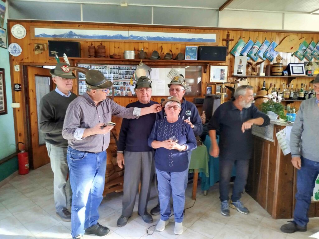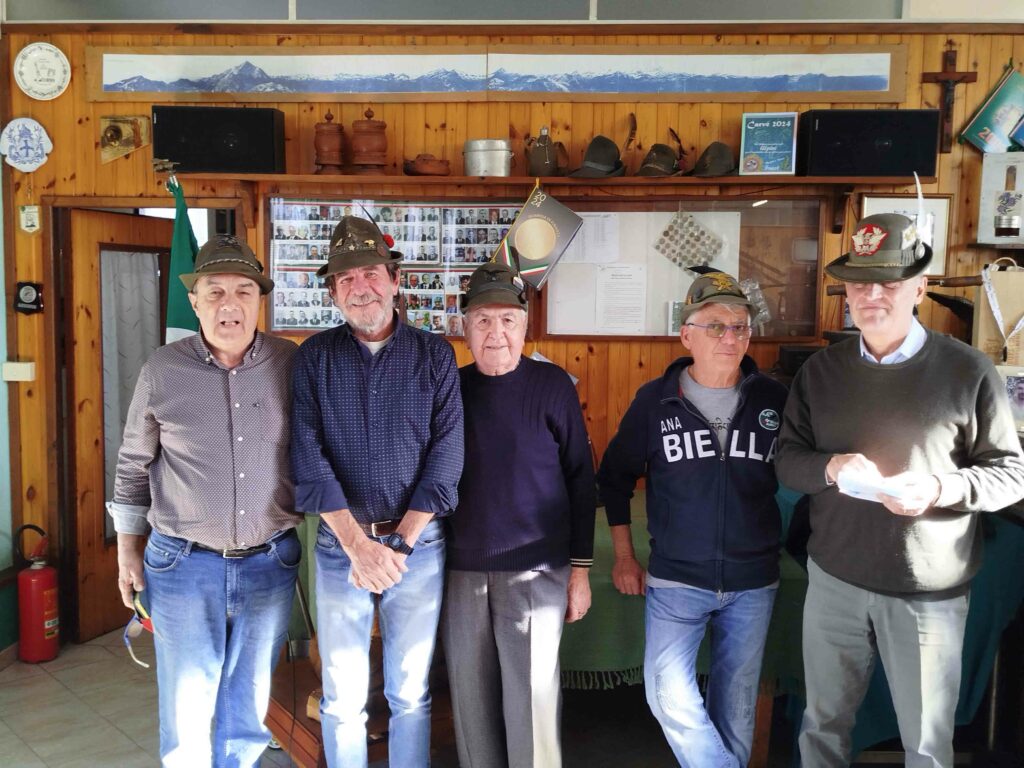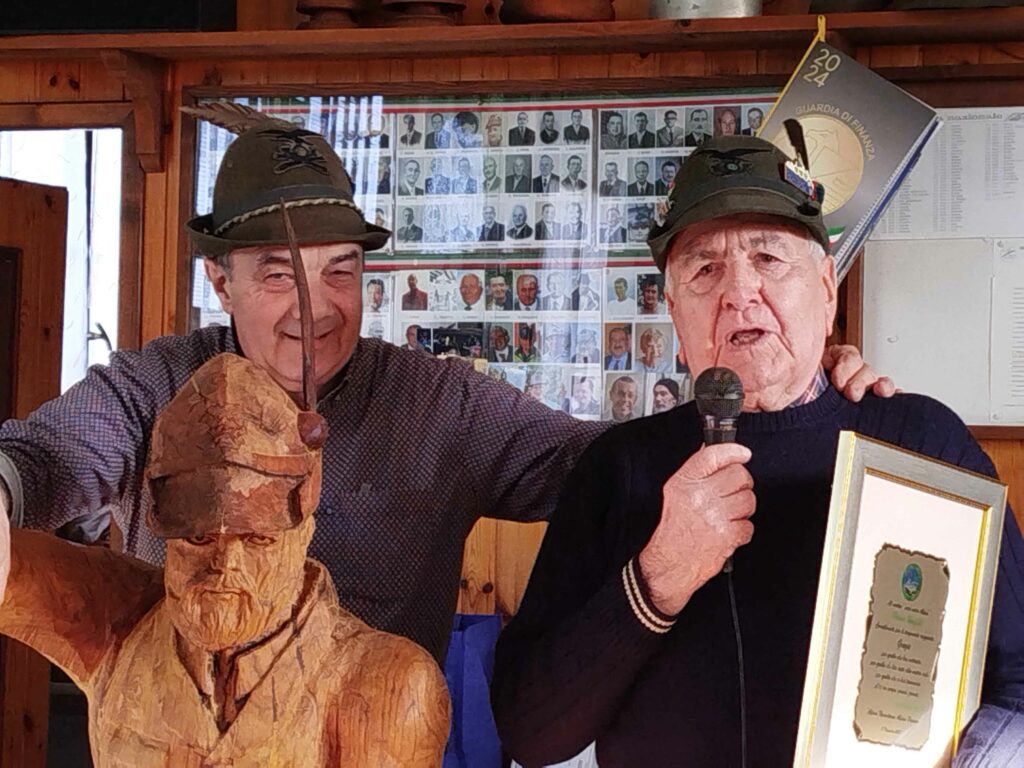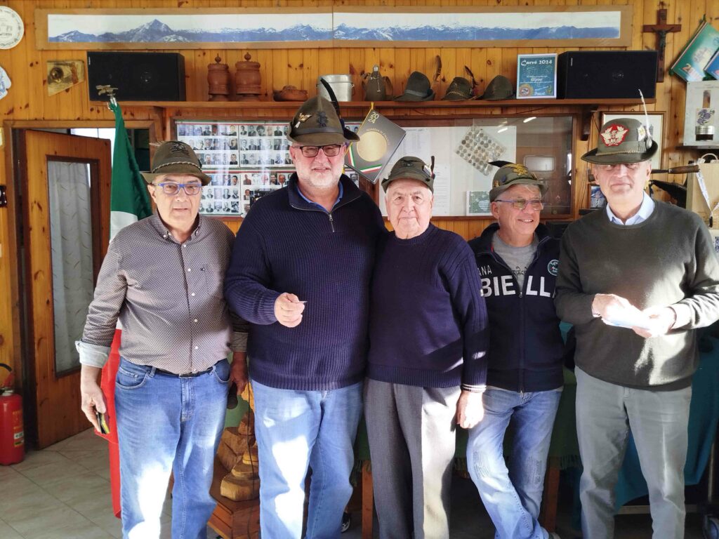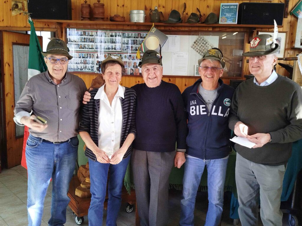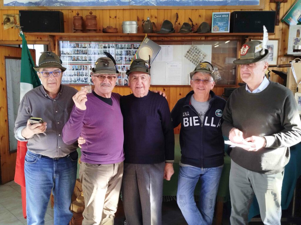 Domenica 23 Novembre, durante i festeggiamenti per i  90 anni del decano del gruppo di Santhià Primo Ruffilli, il capogruppo Beniamino Averono con i consiglieri sezionali Maurizio Bollea, paolo Racchi e Claudio Vercellotti, hanno consegnato la spilletta dell’adunata hai volontari impegnati durante l’adunata.