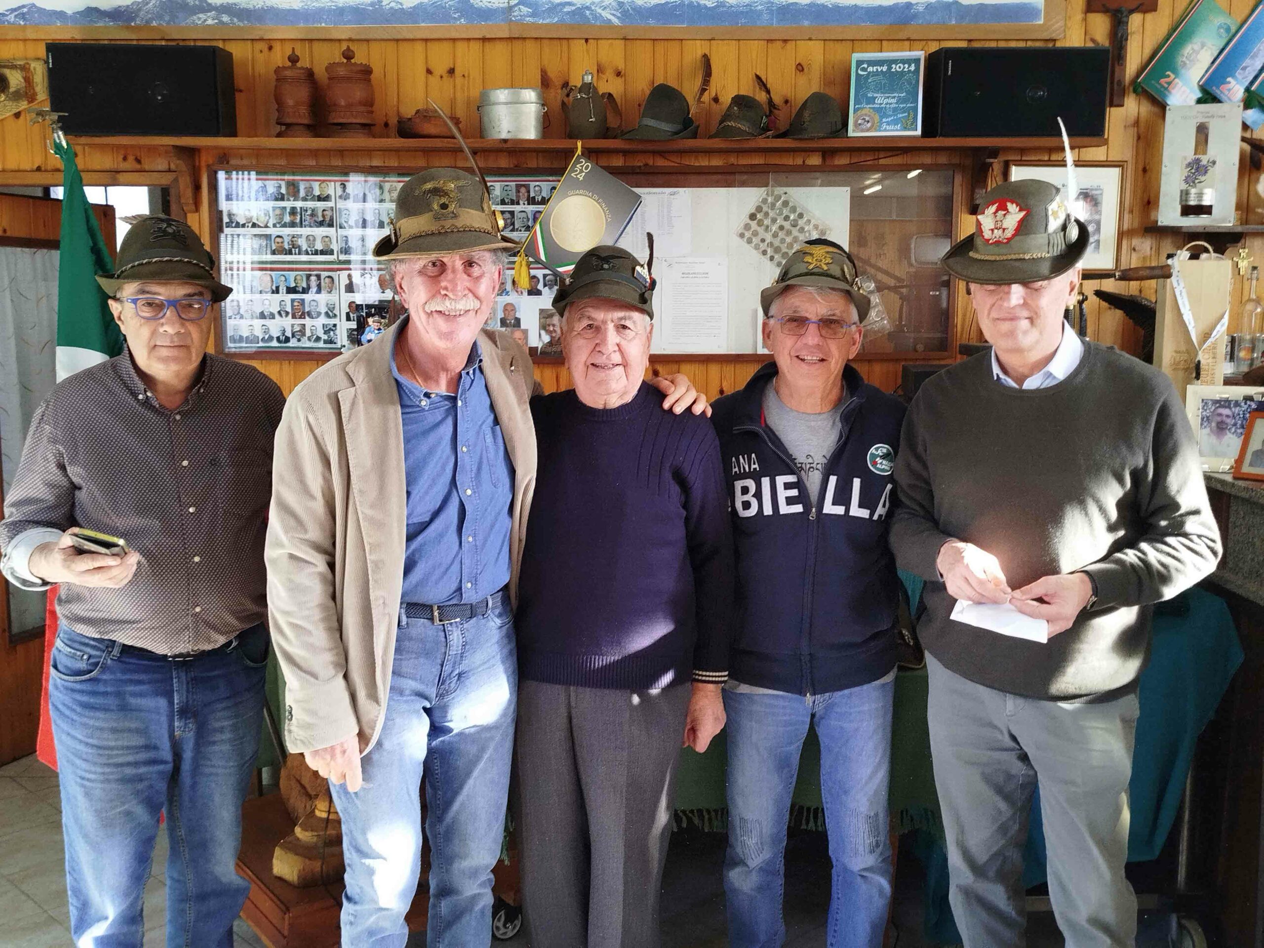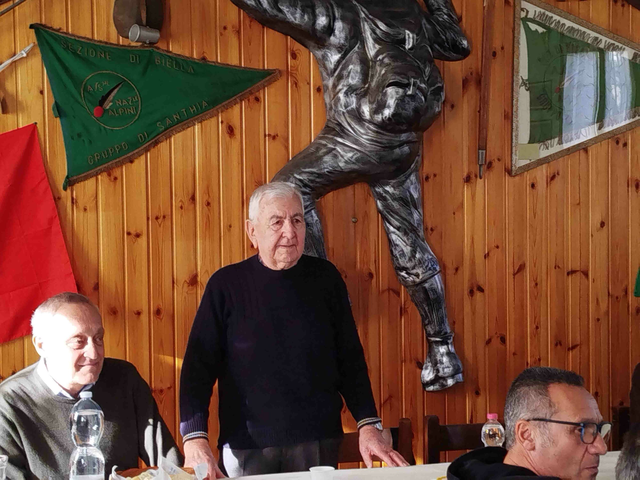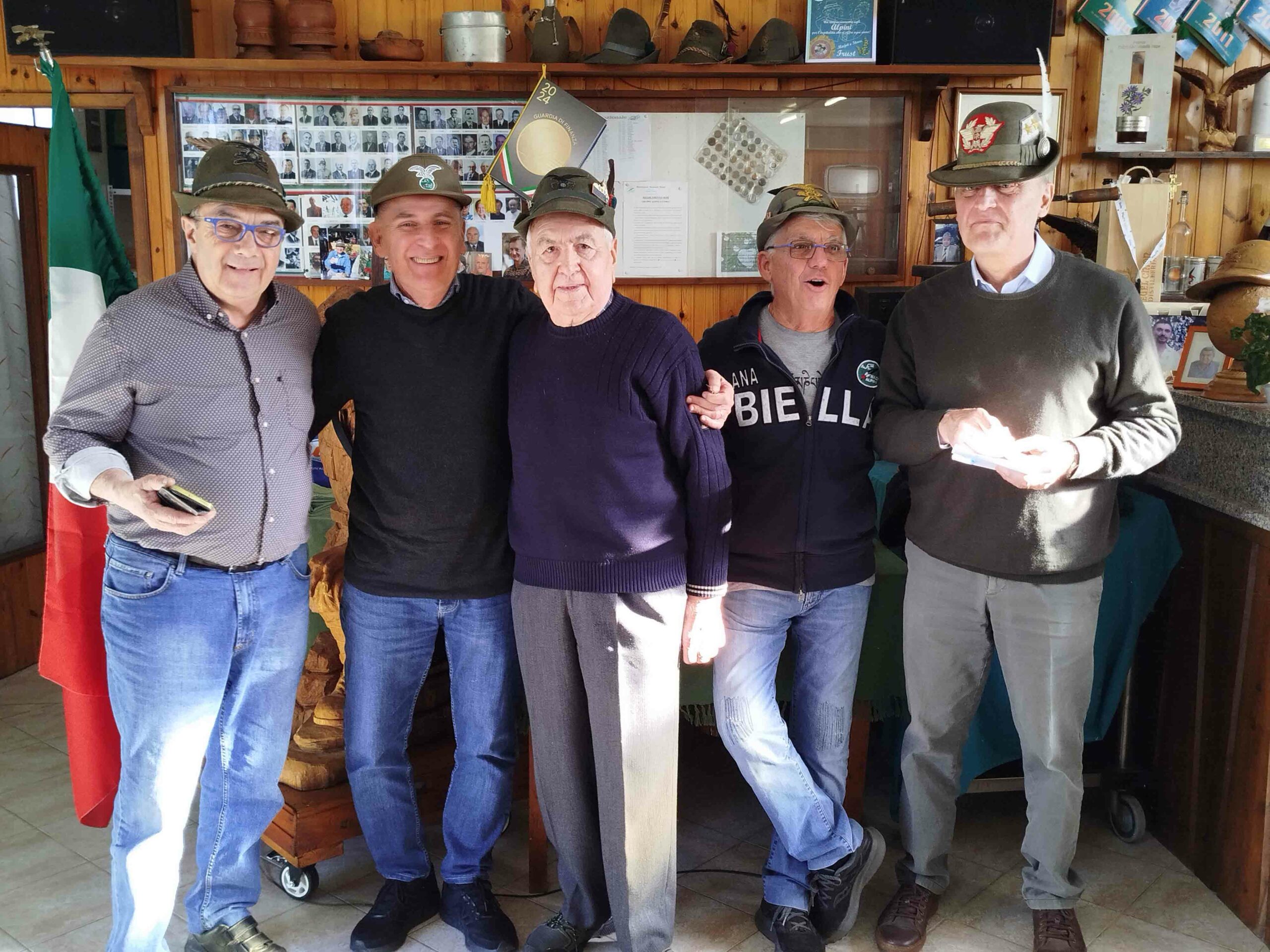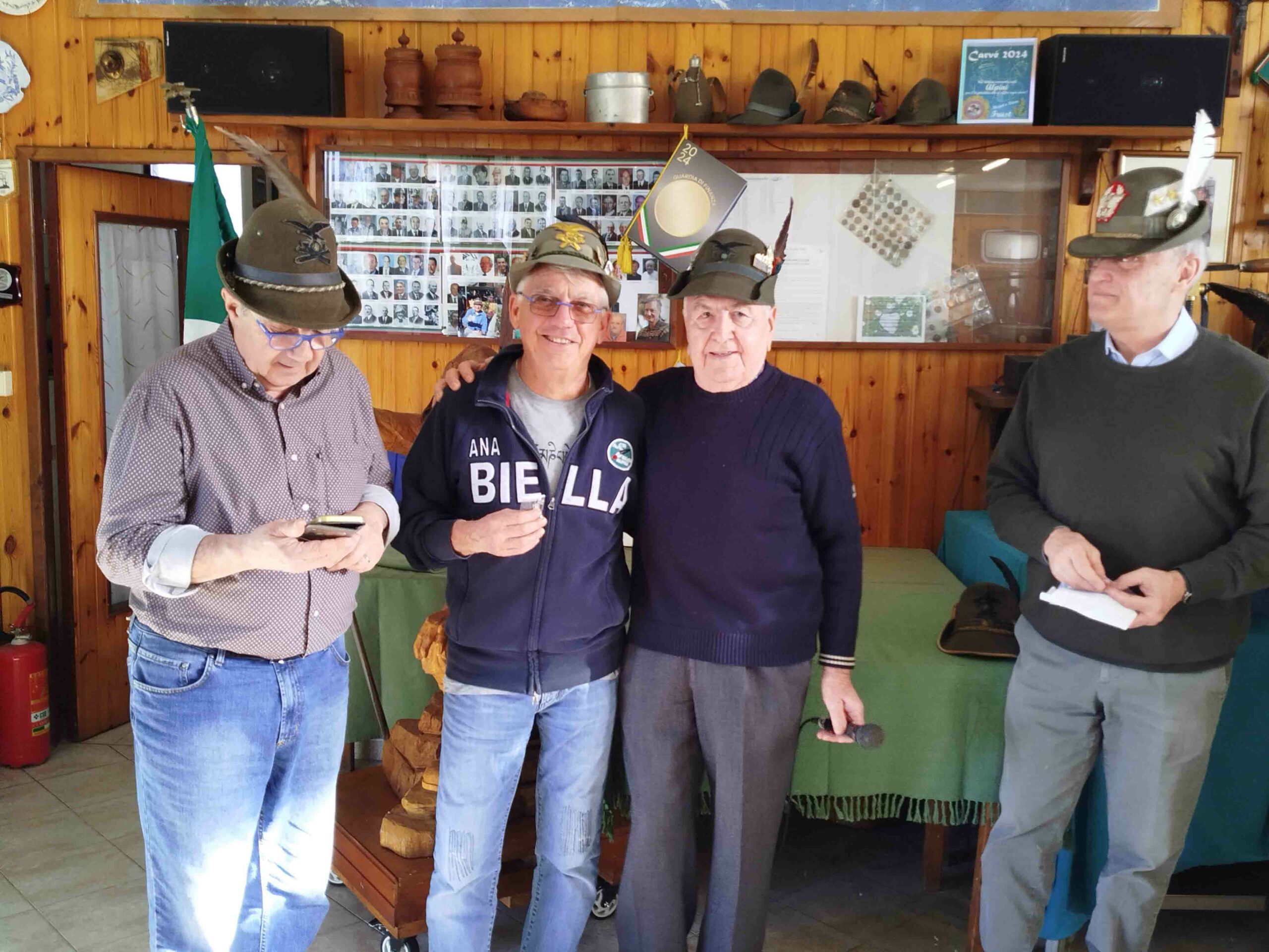 Domenica 23 Novembre, durante i festeggiamenti per i  90 anni del decano del gruppo di Santhià Primo Ruffilli, il capogruppo Beniamino Averono con i consiglieri sezionali Maurizio Bollea, paolo Racchi e Claudio Vercellotti, hanno consegnato la spilletta dell’adunata hai volontari impegnati durante l’adunata.