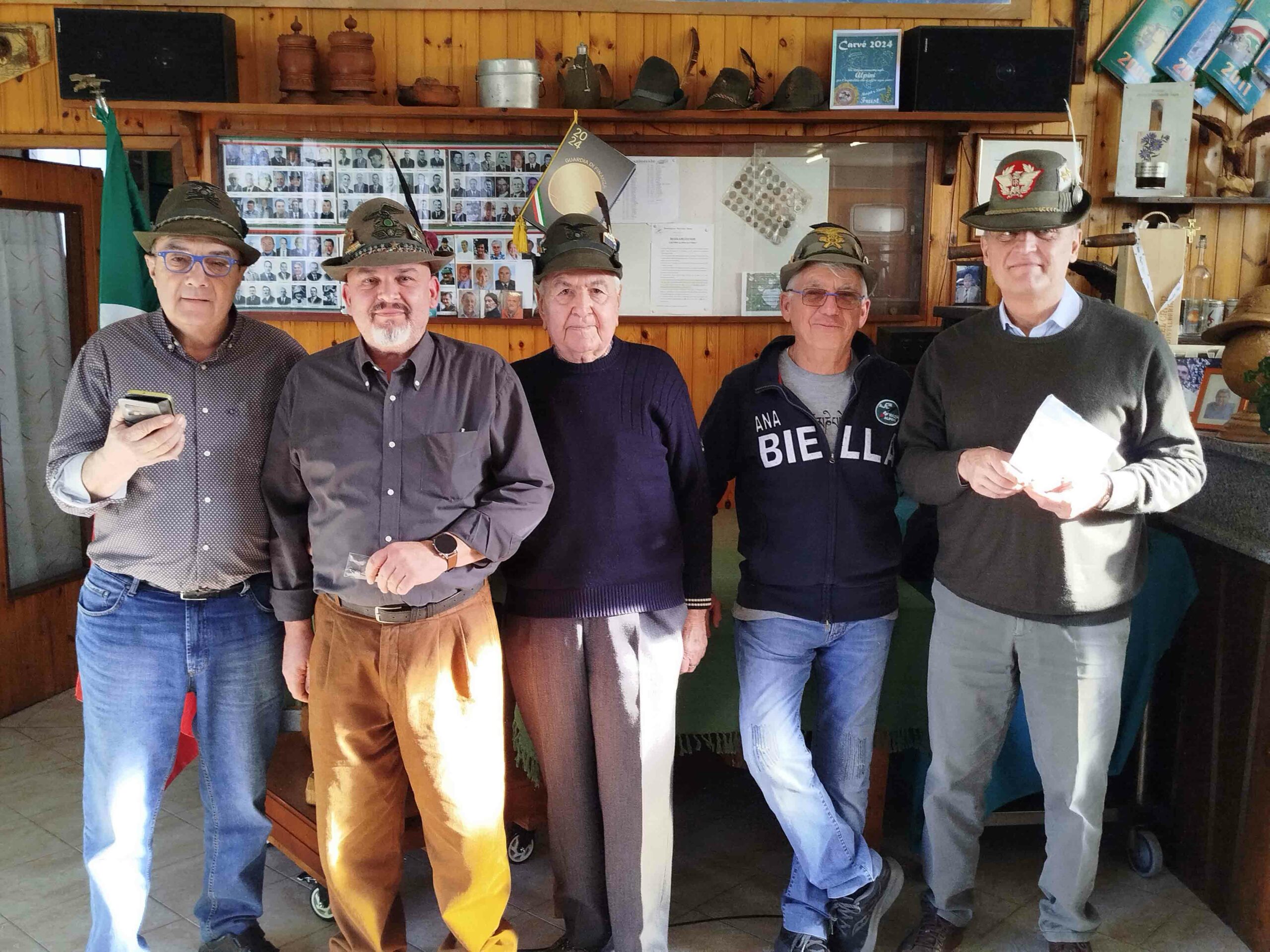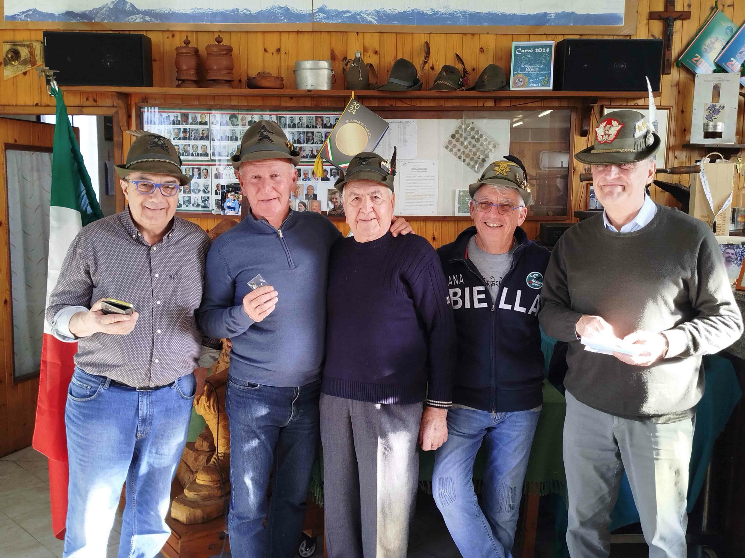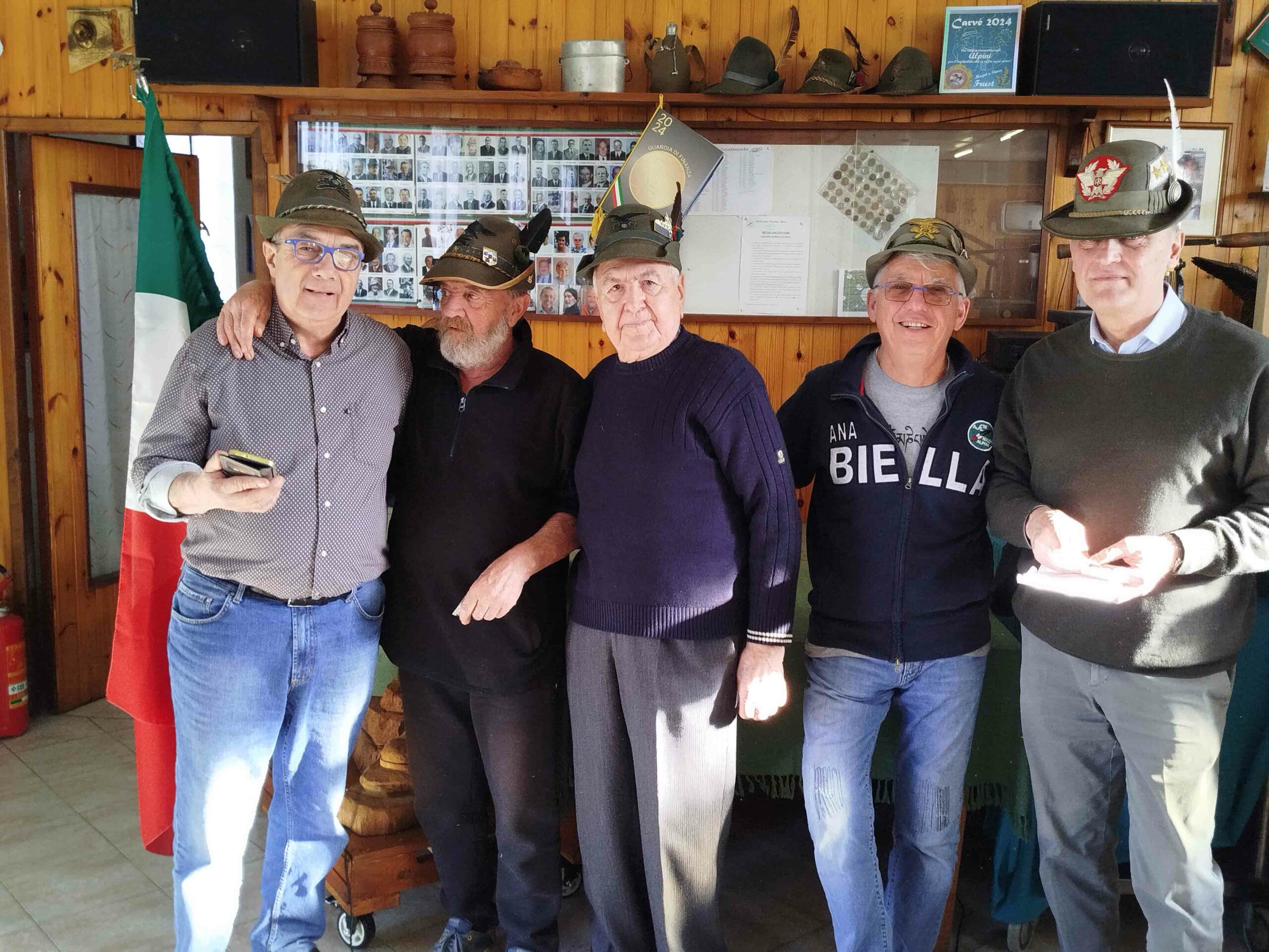 Domenica 23 Novembre, durante i festeggiamenti per i  90 anni del decano del gruppo di Santhià Primo Ruffilli, il capogruppo Beniamino Averono con i consiglieri sezionali Maurizio Bollea, paolo Racchi e Claudio Vercellotti, hanno consegnato la spilletta dell’adunata hai volontari impegnati durante l’adunata.